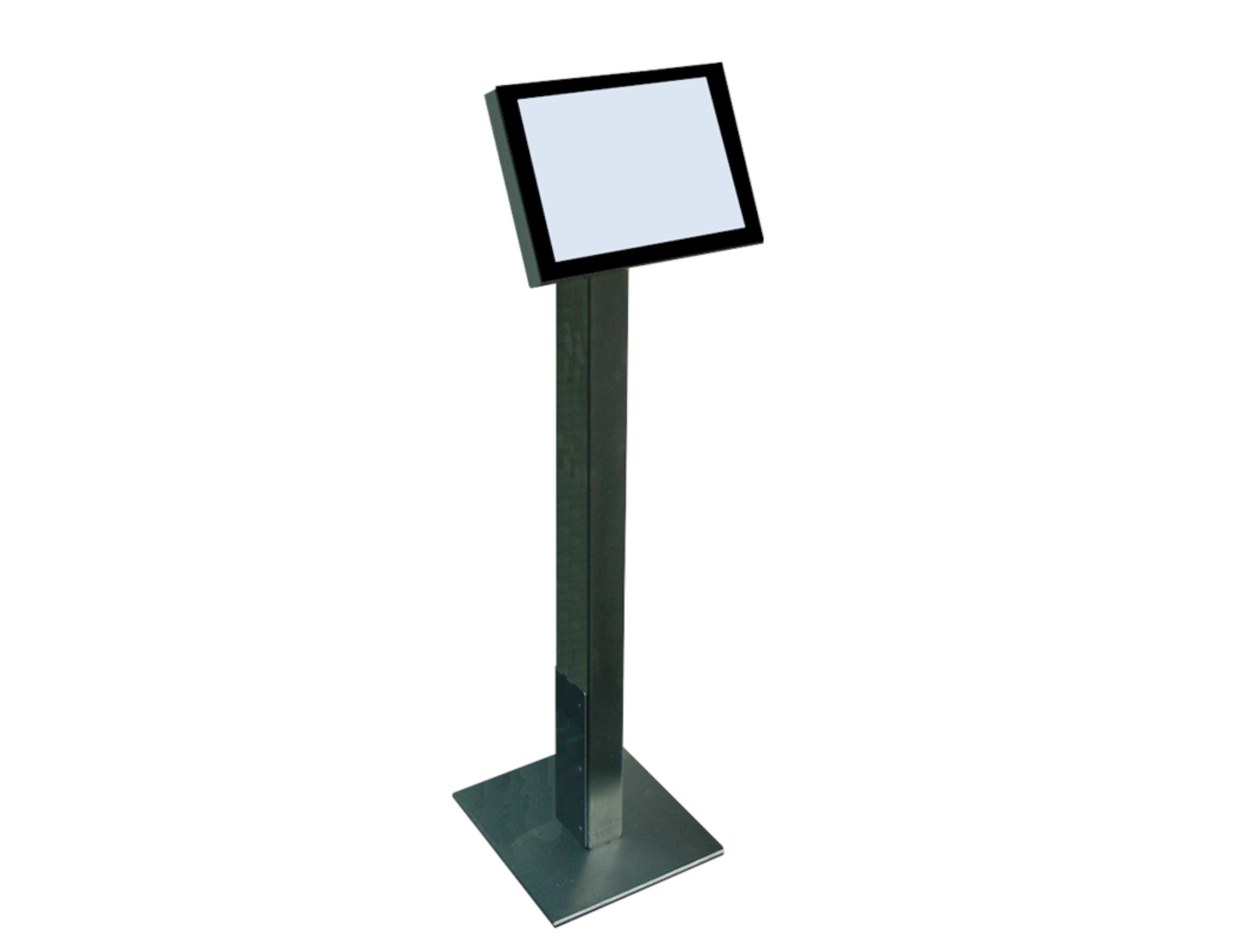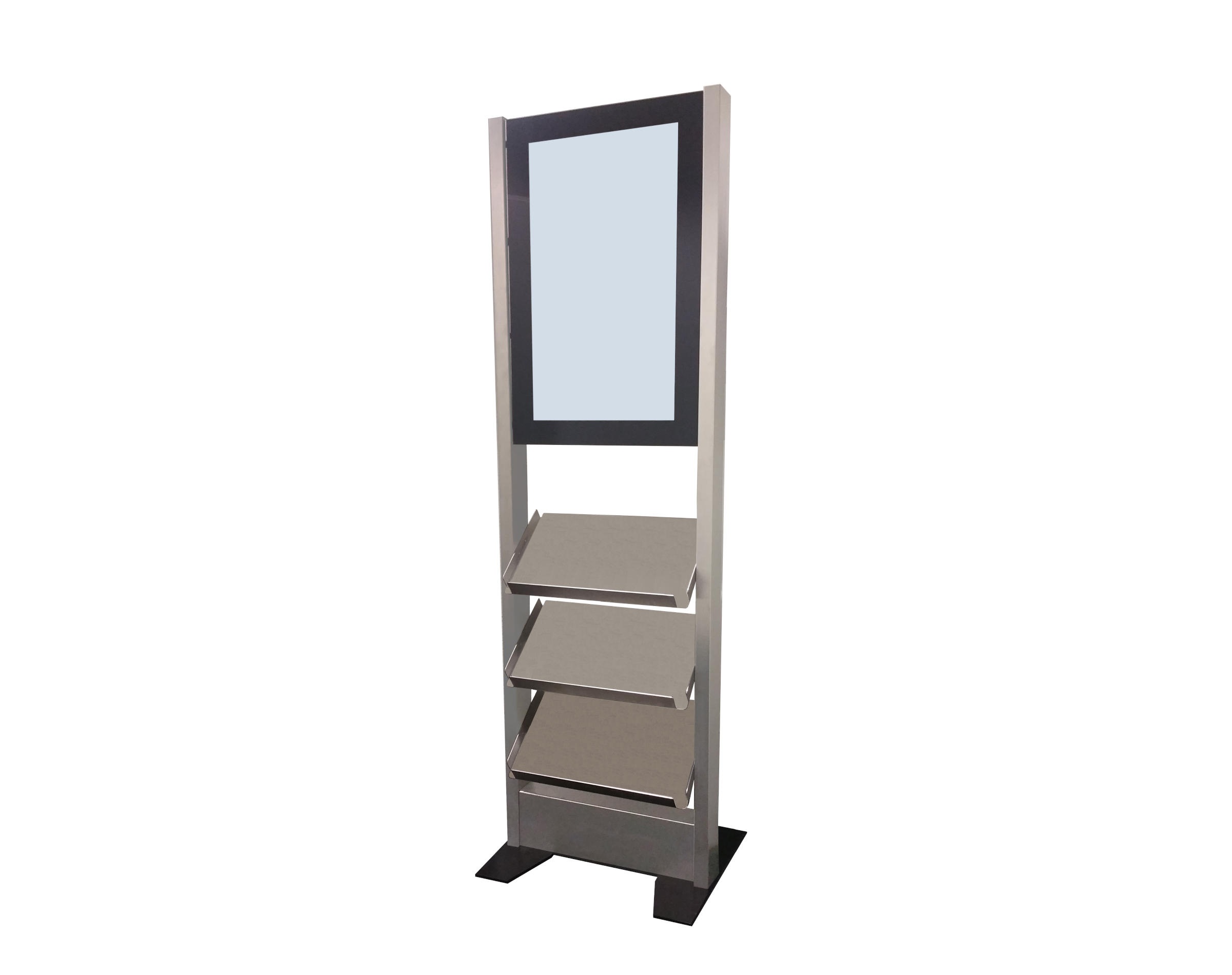 Das Modell 49 PA (Display Board in Portrait-Format mit Ablagen) ist ein freistehendes Gerät welches über 2 Edelstahl-Säulen, ein 49" Display Board für den 24/7 Betrieb, 3 Ablagen und 2 Bodenplatten verfügt. Das System kann auch direkt auf den Boden geschraubt werden. Um den Monitor zu schützen wird er mit einem gehärteten 8mm Glas abgedeckt.