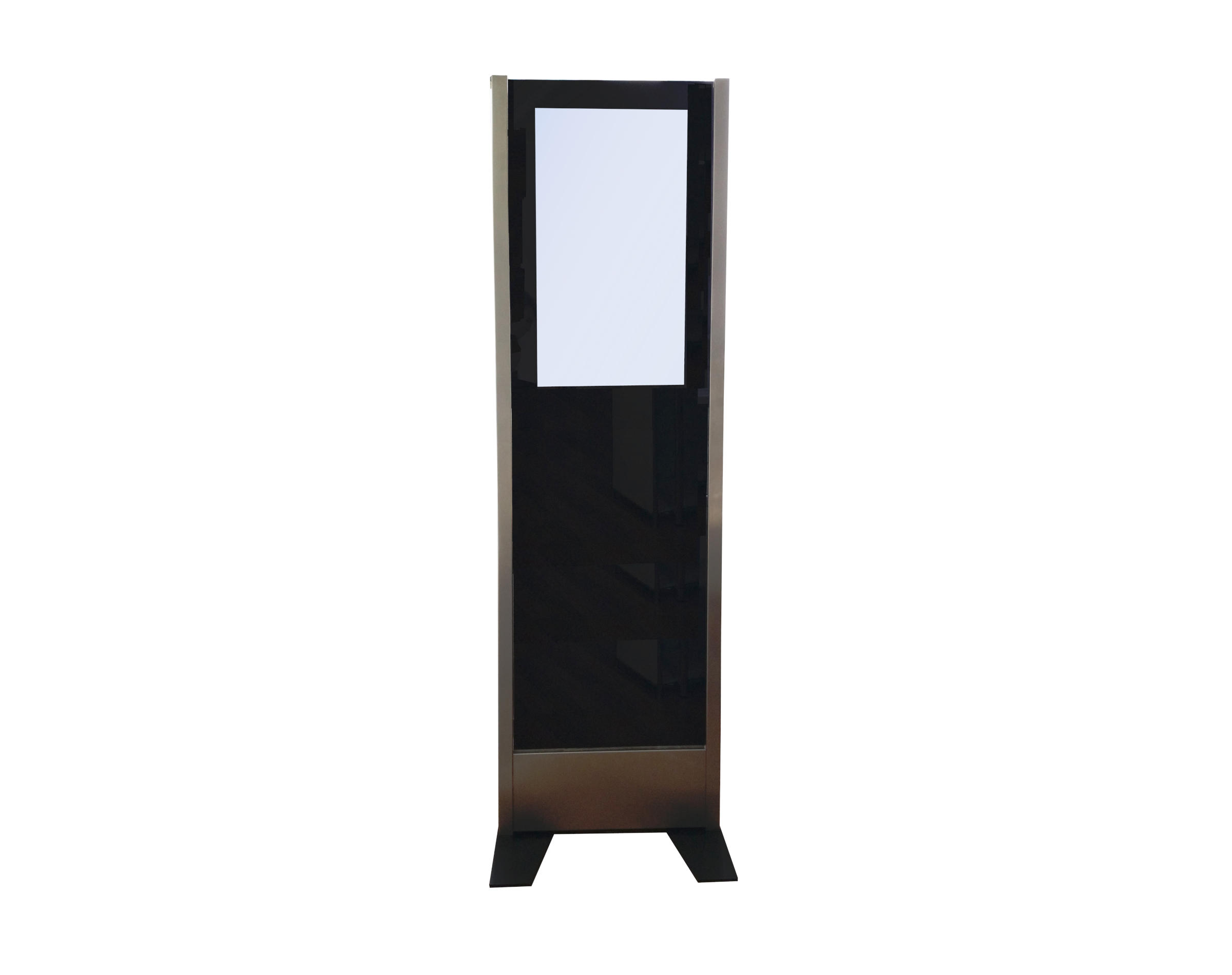 Das Modell 49 PO (Display Board in Portrait-Format ohne Füllung) ist ein freistehendes Gerät welches über 2 Edelstahl-Säulen, ein 49" Display Board für den 24/7 Betrieb und 2 Bodenplatten verfügt. Das System kann auch direkt auf den Boden geschraubt werden. Um den Monitor zu schützen wird er mit einem gehärteten 6mm Glas abgedeckt.