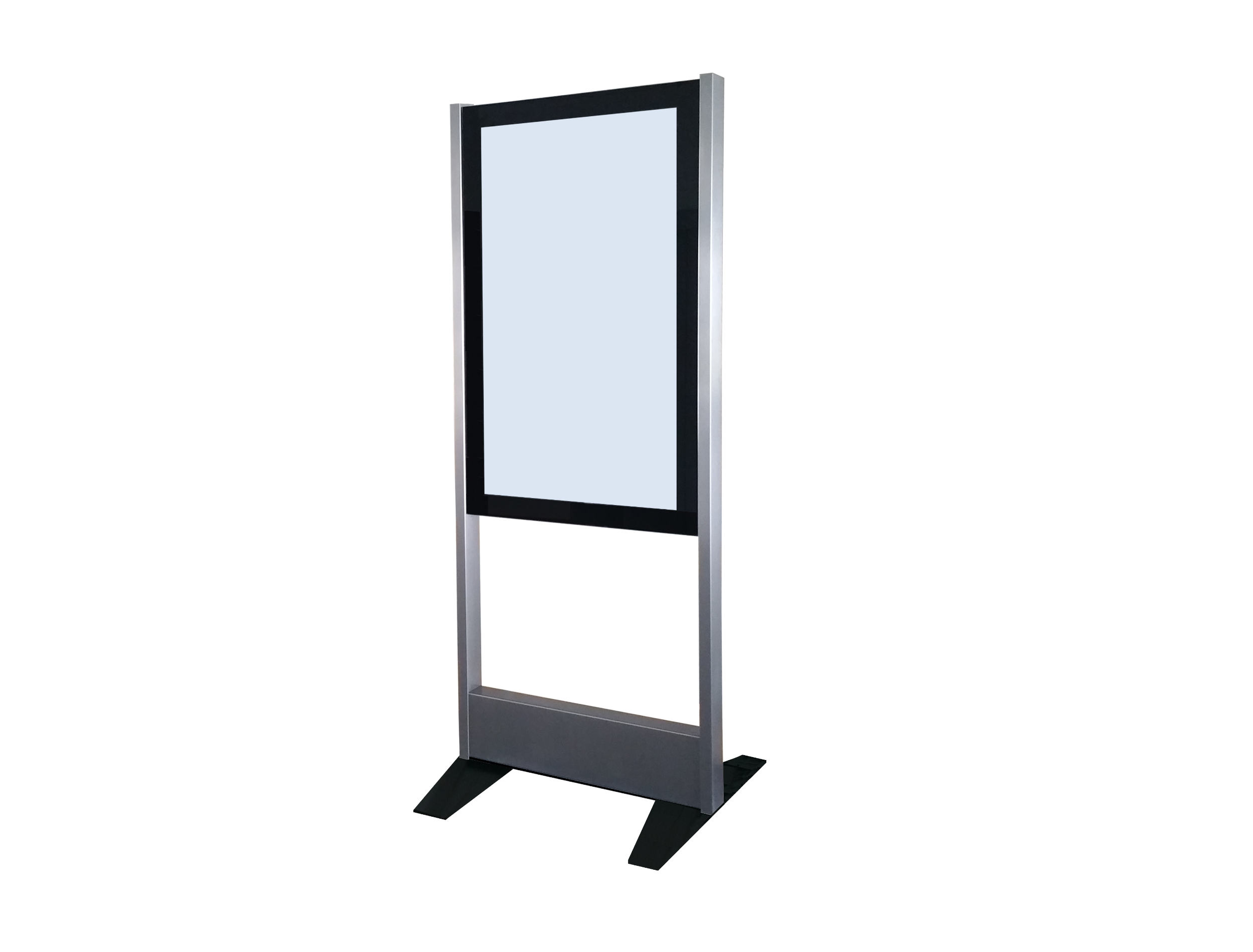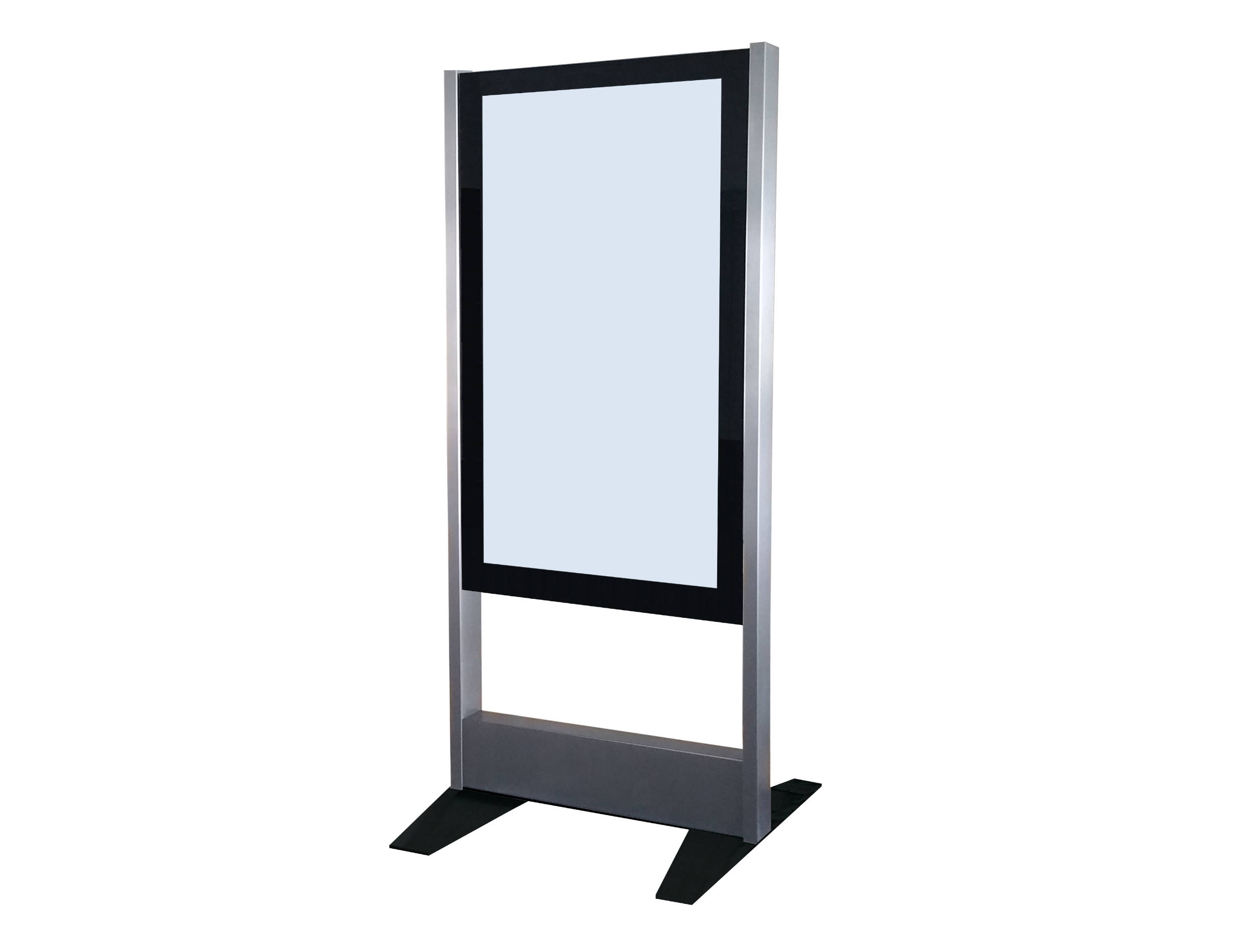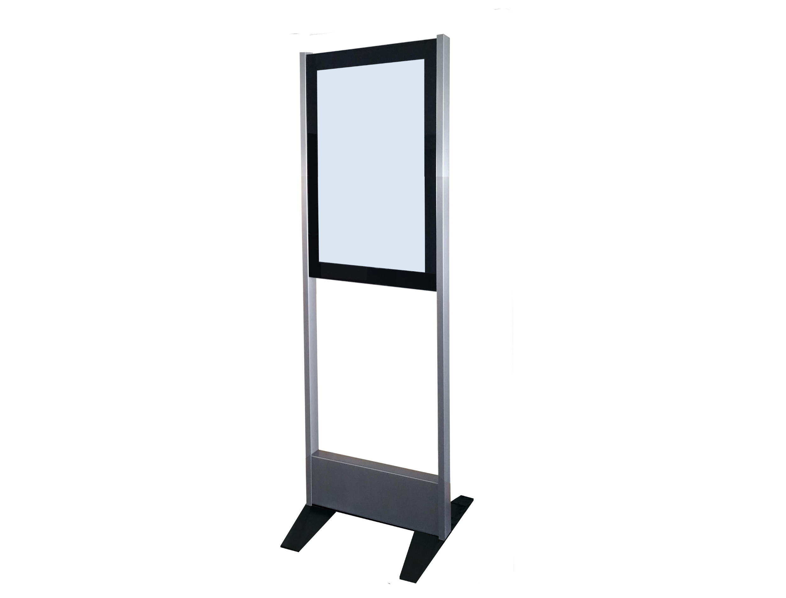 Das Modell 55 PO (Display Board in Portrait-Format ohne Füllung) ist ein freistehendes Gerät welches über 2 Edelstahl-Säulen, ein 55" Display Board für den 24/7 Betrieb und 2 Bodenplatten verfügt. Das System kann auch direkt auf den Boden geschraubt werden. Um den Monitor zu schützen wird er mit einem gehärteten 8mm Glas abgedeckt.