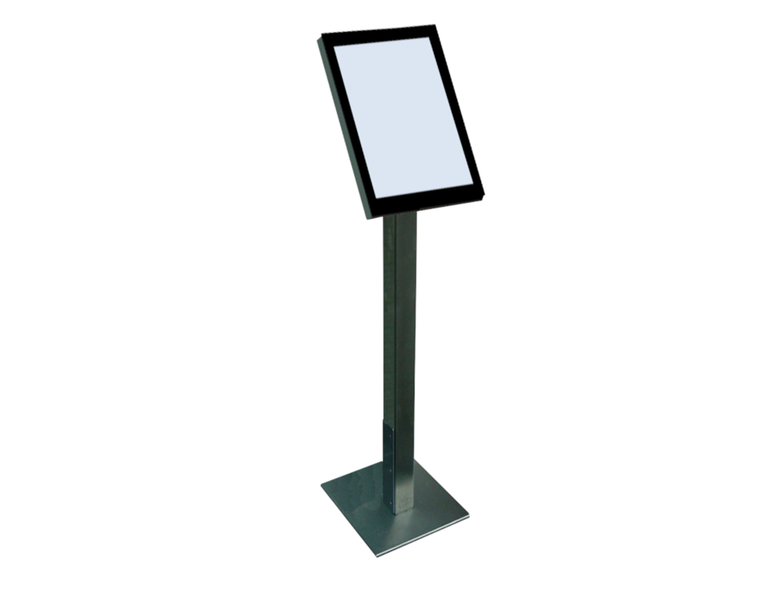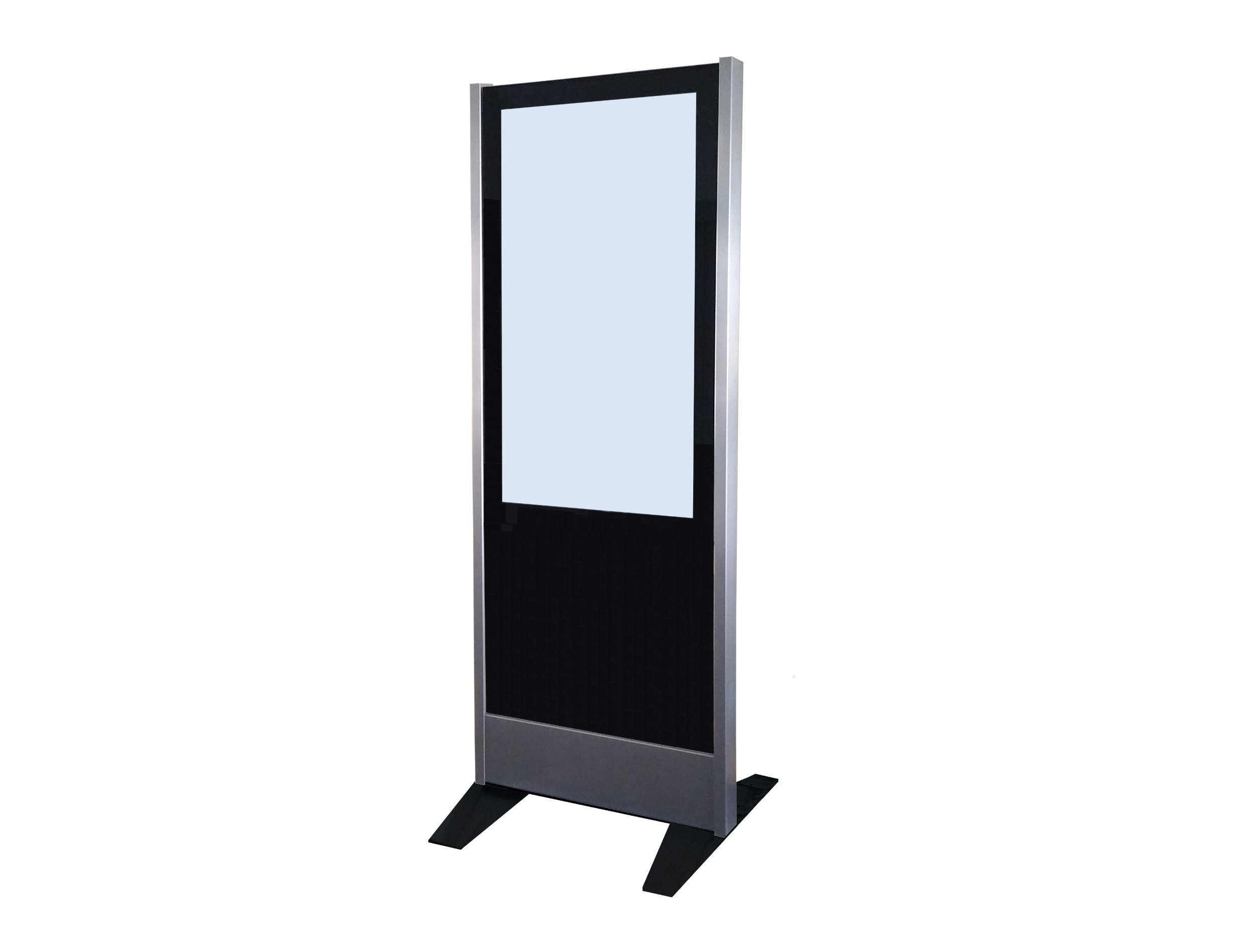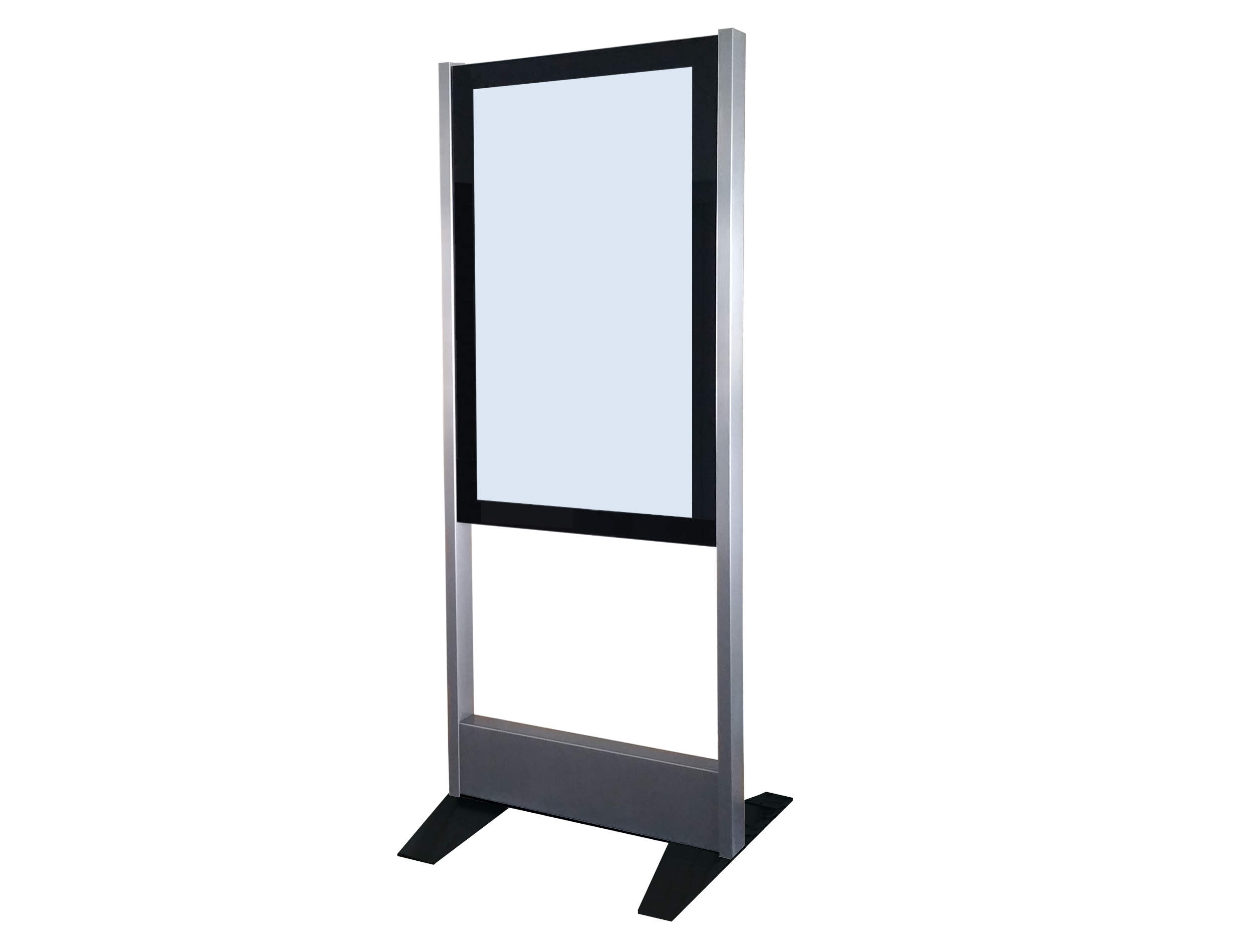 Das Modell 55 PO (Display Board in Portrait-Format ohne Füllung) ist ein freistehendes Gerät welches über 2 Edelstahl-Säulen, ein 55" Display Board für den 24/7 Betrieb und 2 Bodenplatten verfügt. Das System kann auch direkt auf den Boden geschraubt werden. Um den Monitor zu schützen wird er mit einem gehärteten 8mm Glas abgedeckt.
