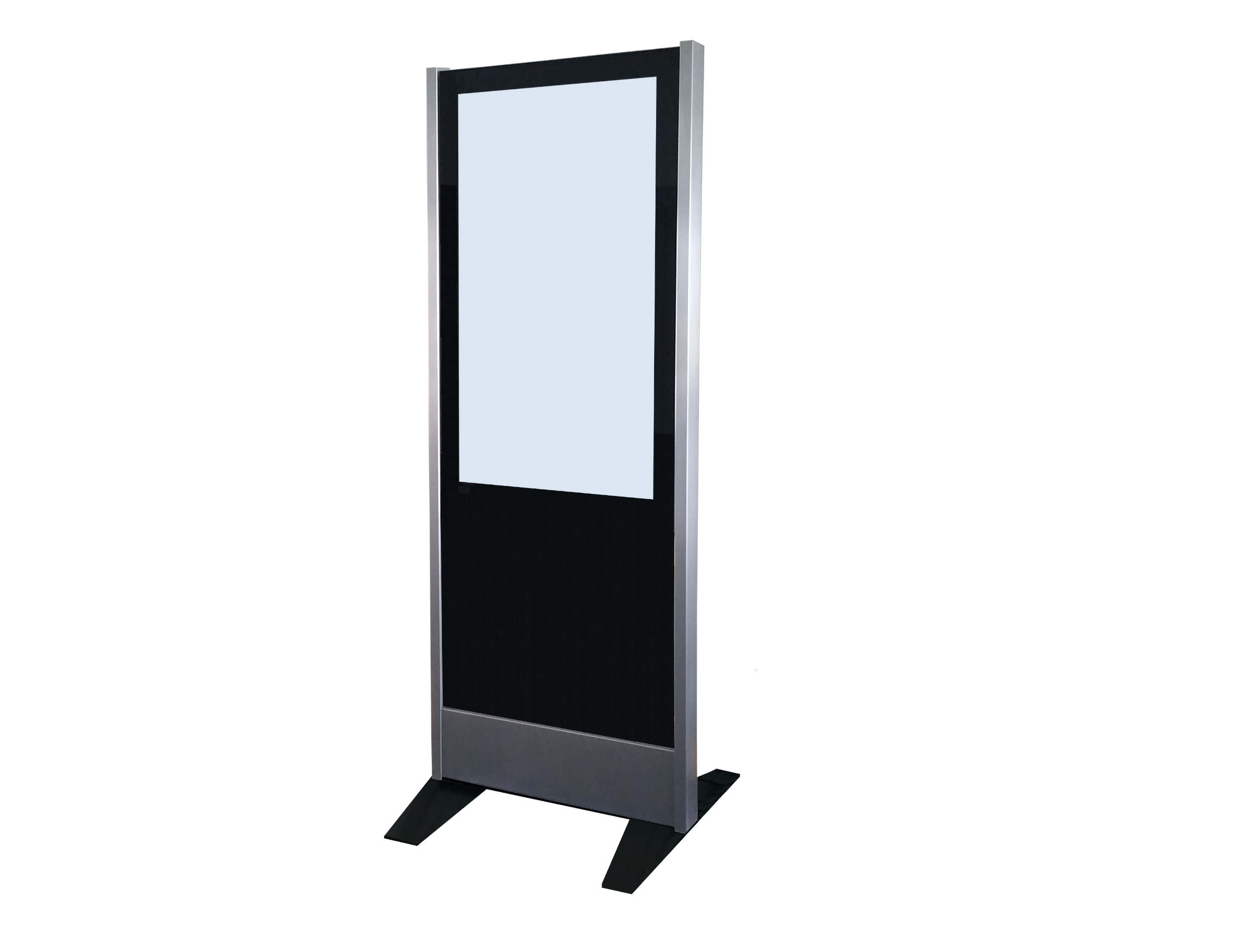 Das Modell 65 PO (Display Board in Portrait-Format ohne Füllung) ist ein freistehendes Gerät welches über 2 Edelstahl-Säulen, ein 65" Display Board für den 24/7 Betrieb und 2 Bodenplatten verfügt. Das System kann auch direkt auf den Boden geschraubt werden. Um den Monitor zu schützen wird er mit einem gehärteten 8mm Glas abgedeckt.
