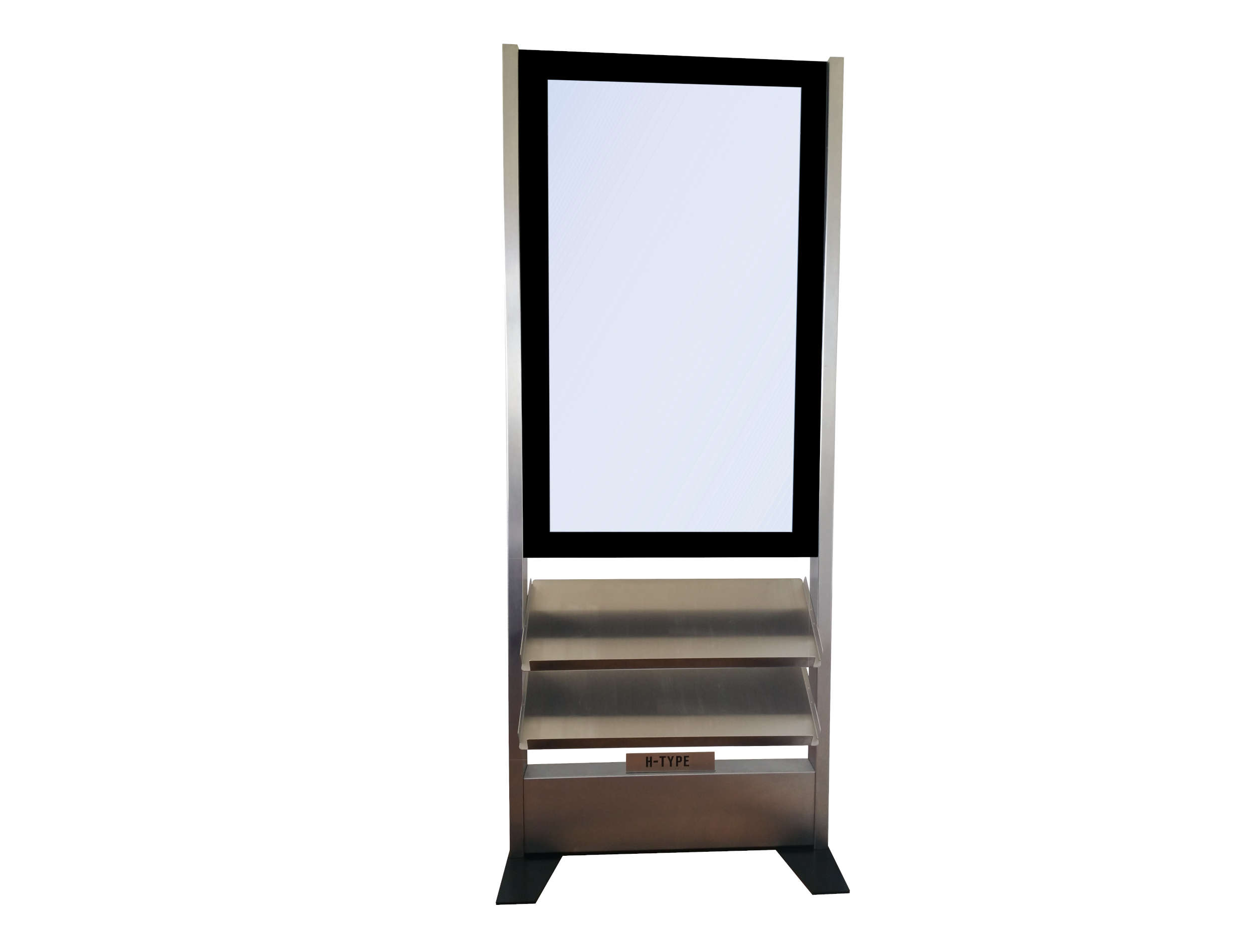 Das Modell 55 PA (Display Board in Portrait-Format mit Ablagen) ist ein freistehendes Gerät welches über 2 Edelstahl-Säulen, ein 55" Display Board für den 24/7 Betrieb, 2 Ablagen und 2 Bodenplatten verfügt. Das System kann auch direkt auf den Boden geschraubt werden. Um den Monitor zu schützen wird er mit einem gehärteten 8mm Glas abgedeckt.